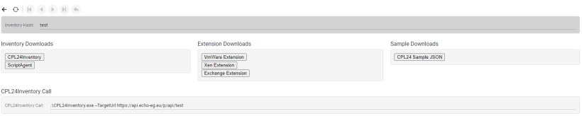 In the downloads section you can see your inventory hash, application and tools downloads and a sample call for your environment. Please see the CPL24Inventory for details how to use and debug.